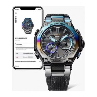 Часы из премиальной серии MTG собираются только в Японии на высоко-технологичном производстве CASIO в Ямагата и данная модель не исключение. В часах по прежнему используется технологически безупречная сталь Core Guard® с повышенной защитой от царапин, сферическое сапфировое стекло с анти-бликом и карбон, что придает им абсолютную ударопрочность. Модель получила черный полимерный ремешок, дополняющий яркий аутентичный внешний вид часов. Точность времени хода достигается гибридной системой: автоматической синхронизацией по 6-канальному радио-сигналу с атомными часами на разных континентах и через связь со смартфоном посредством Bluetooth®. Часы полностью защищены от падений, влияния центробежной силы, перегрузок и вибраций, а также оснащены солнечной батареей и водозащитой до 200 метров. Противоударный корпус защищает механизм от ударов и вибрации. Противоударная система Dual Core Guard состоит из двух систем Carbon Core Guard и Metal Core Card.